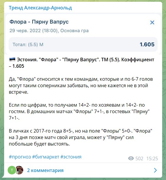 Канал запущен несколько лет назад и специализируется исключительно на футболе, что является сильной стороной: узкая фокусировка повышает качество аналитики по сравнению с мультикапперами. Довольно часто публикуются бесплатные ординары с коэффициентами 1.50-2.00. Основной акцент на смолл-маркетах: желтые карточки, угловые, фолы, удары от ворот, добавочное время.