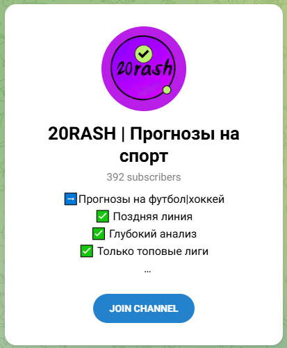 Под нашим фокусом сейчас оказался канал 20RASH в Telegram. Он управляется каппером Раушаном Ульябаевым. Этот каппер специализируется на прогнозах на футбол и хоккей. Касательно первого — это в основном топ-лиги и турниры, реже вторые дивизионы. По хоккею в основном разбираются НХЛ и КХЛ.