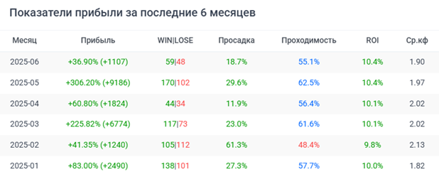 Аналитики хотелось бы больше, чтобы понимать на основании чего каппер принимает решения. Бывают и минусовые периоды с просадками.