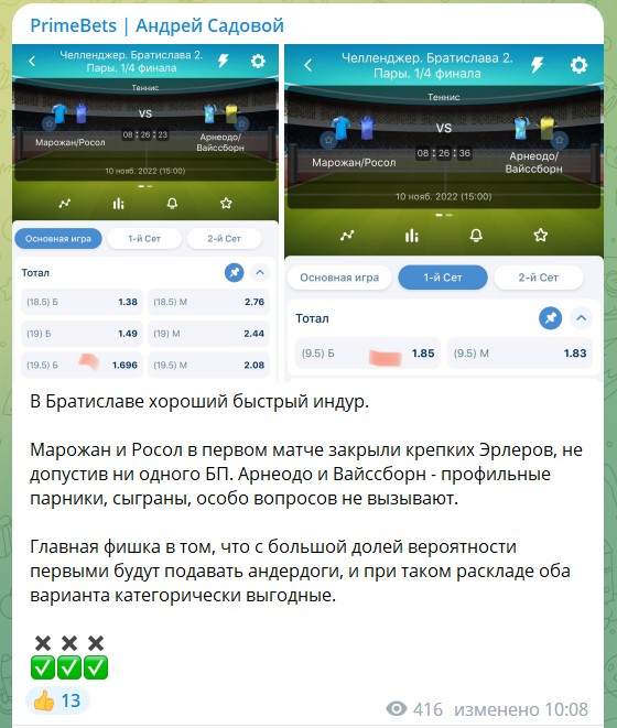 Данный канал, как нетрудно догадаться, управляется каппером Андреем Садовым. Реальное ли это лицо — неизвестно. На сейчас его аудитория составляет примерно 1800 подписчиков. Канал предлагает ставки на теннис, футбол, баскетбол.