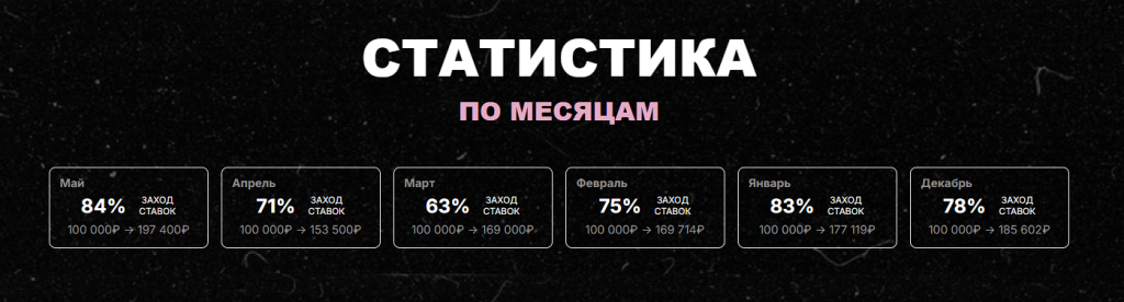По отчетам, которые публикуются на сайте, бывают и месяцы просадок (до 63% успешных прогнозов), но бывают и успешные месяцы (84%). Статистика никем не верифицирована, поэтому доверять ли ей — вопрос открытый.
